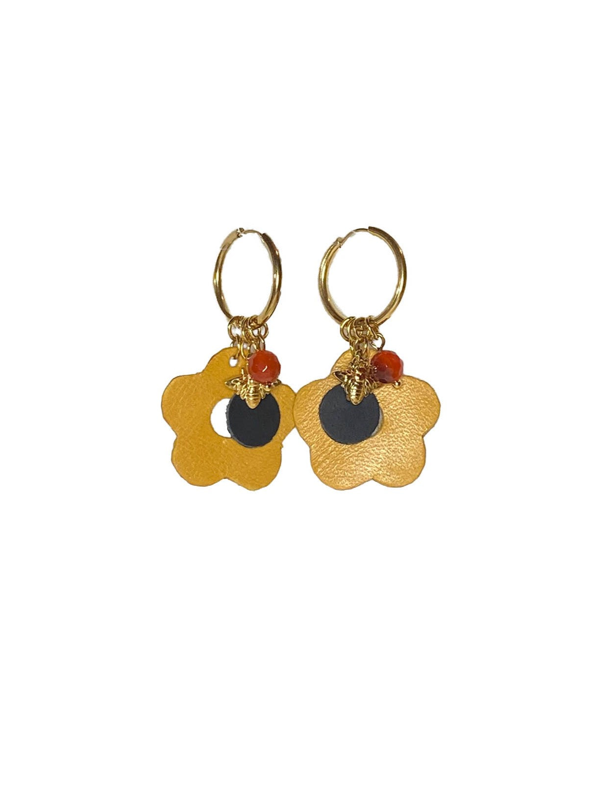Créoles en acier doré avec breloques en cuir, breloques abeille et perles.